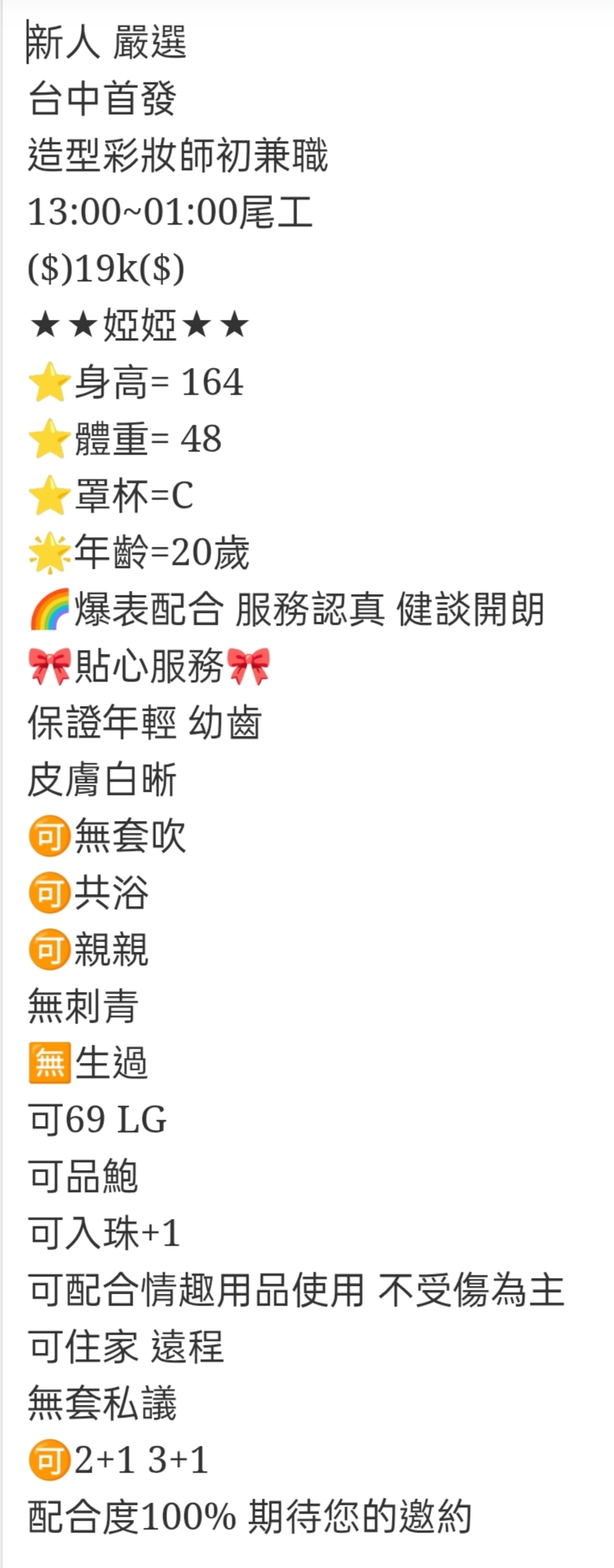 ??台中外約台妹 婭婭 新人 嚴選 台中首發 造型彩妝師初兼職 13:00~01:00尾工 ($)19k($) ★★婭婭★★ ⭐️身高= 164 ⭐️體重= 48 ⭐️罩杯=C ?年齡=20歲 ?爆表配合 服務認真 健談開朗 ?貼心服務? 保證年輕 幼齒 皮膚白晰 ?️無套吹 ?️共浴 ?️親親 無刺青 ?️生過 可69 LG 可品鮑 可入珠+1 可配合情趣用品使用 不受傷為主 可住家 遠程 無套私議 ?️2+1 3+1 配合度100% 期待您的邀約 相關商品 Quick View Quick View 🇹🇼台中北區定點台妹/可外約 叮噹 Quick View Quick View 🇹🇼台中北區定點台妹/可外約 球球 Quick View Quick View 🇹🇼台中高檔外約台妹 天心