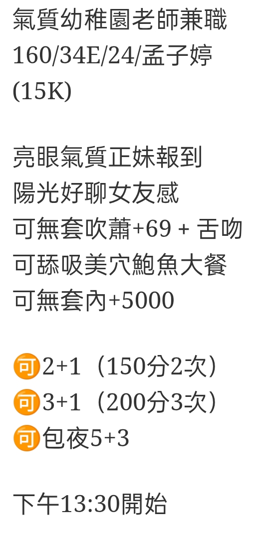 🇹🇼台中外約台妹 孟子婷 氣質幼稚園老師兼職 160/34E/24/孟子婷 (15K) 亮眼氣質正妹報到 陽光好聊女友感 可無套吹蕭+69+舌吻 可舔吸美穴鮑魚大餐 可無套內+5000 ?2+1(150分2次) ?3+1(200分3次) ?包夜5+3 下午13:30開始 相關商品 Quick View Quick View 🇹🇼台中外約台妹 陳思妤 Quick View Quick View 🇹🇼台中外約台妹 柔安 Quick View Quick View 🇹🇼台中北區定點台妹/可外約 叮噹
