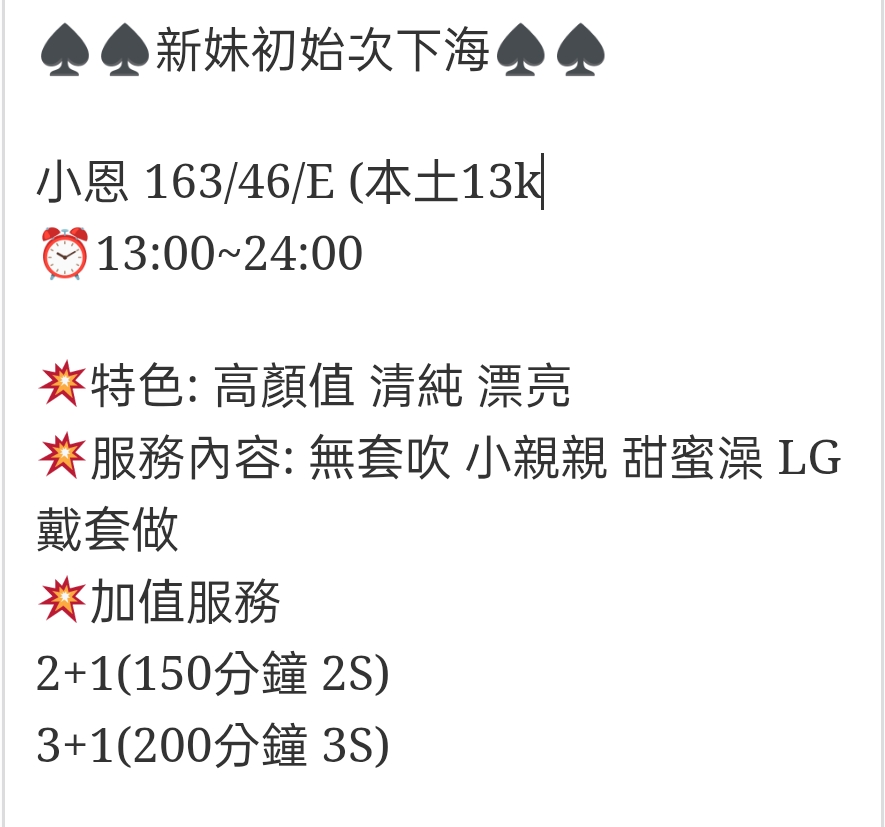 🇹🇼台中外約台妹 小恩 ♠️♠️新妹初始次下海♠️♠️ 小恩 163/46/E (本土13k ⏰13:00~24:00 💥特色: 高顏值 清純 漂亮 💥服務內容: 無套吹 小親親 甜蜜澡 LG 戴套做 💥加值服務 2+1(150分鐘 2S) 3+1(200分鐘 3S) 相關商品 Quick View Quick View 🇹🇼台中外約台妹 結衣 Quick View Quick View 🇹🇼台中北區定點台妹/可外約 球球