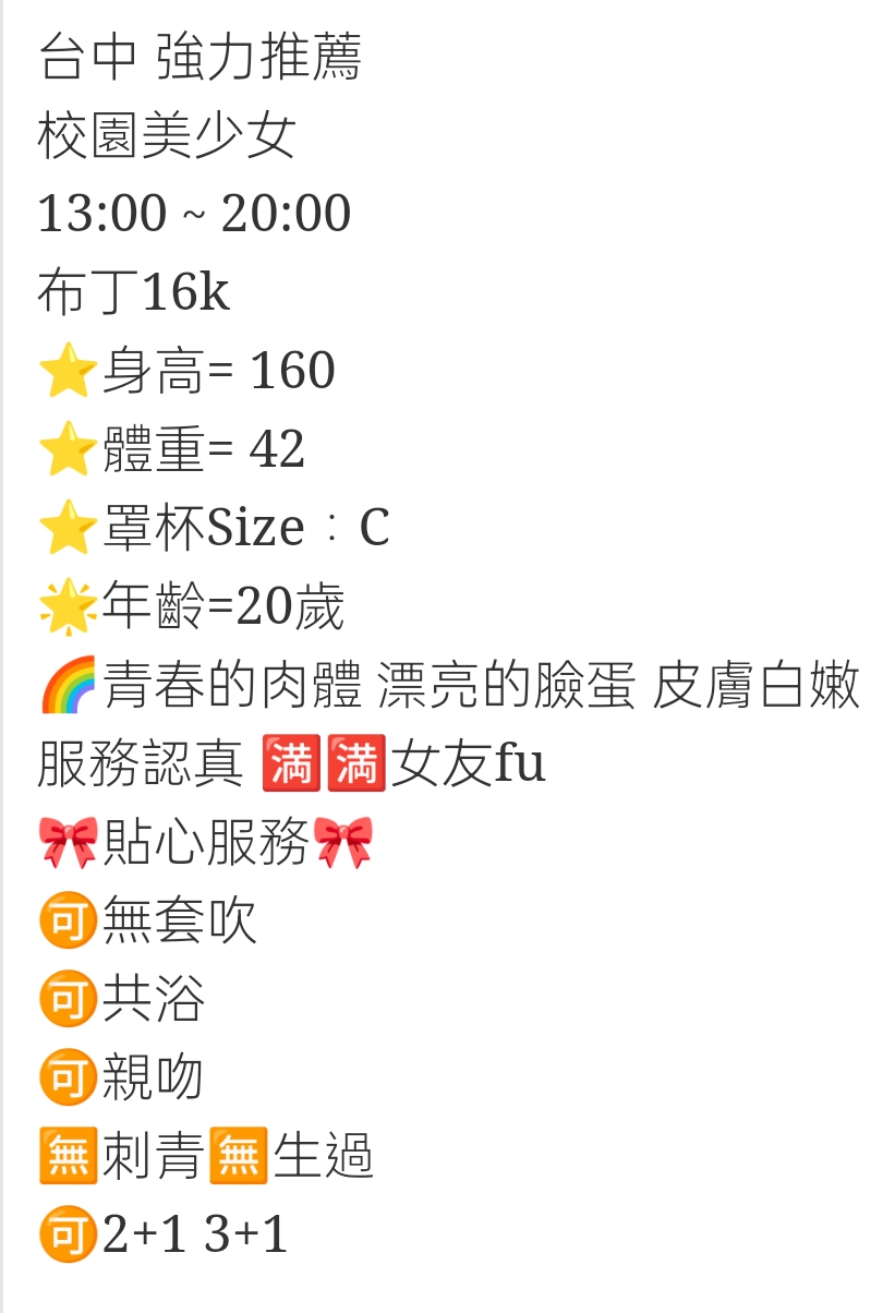 🇹🇼台中外約台妹 布丁 台中 強力推薦 校園美少女 13:00~20:00 布丁16k ⭐️身高= 160 ⭐️體重= 42 ⭐️罩杯Size:C 年齡=20歲 青春的肉體 漂亮的臉蛋 皮膚白嫩 服務認真 女友fu 貼心服務 無套吹 共浴 親吻 刺青 生過 2+1 3+1 相關商品 Quick View Quick View 🇹🇼台中外約台妹 結衣 Quick View Quick View 🇹🇼台中外約台妹 草莓 Quick View Quick View 🇹🇼台中外約台妹 品頤