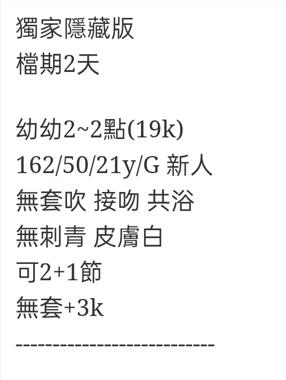 🇹🇼台中外約台妹 幼幼 獨家隱藏版 檔期2天 幼幼2~2點(19k) 162/50/21y/G 新人 無套吹 接吻 共浴 無刺青 皮膚白 可2+1節 無套+3k —‐‐———————- 相關商品 Quick View Quick View 🇹🇼台中外約台妹 品頤 Quick View Quick View 🇹🇼台中外約台妹 薇晞 Quick View Quick View 🇹🇼台中外約台妹 紫薇