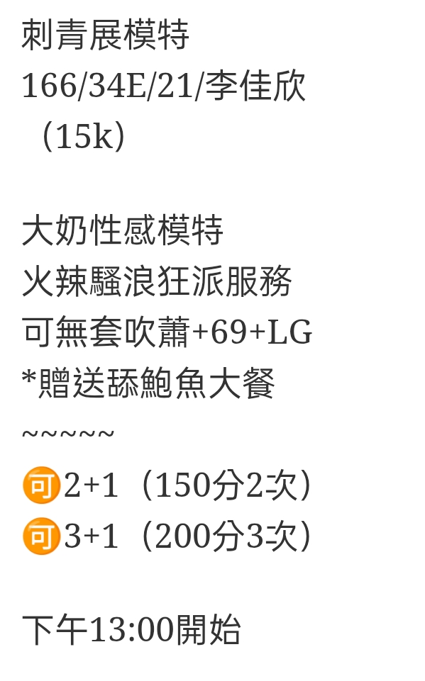 🇹🇼台中外約台妹 李佳欣 刺青展模特 166/34E/21/李佳欣 (15k) 大奶性感模特 火辣騷浪狂派服務 可無套吹蕭+69+LG *贈送舔鮑魚大餐 ~~~~~ 🉑2+1(150分2次) 🉑3+1(200分3次) 下午13:00開始 相關商品 Quick View Quick View 🇹🇼台中外約台妹 若薇 Quick View Quick View 🇹🇼台中外約台妹 草莓 Quick View Quick View 🇹🇼台中外約台妹 孫尚湘