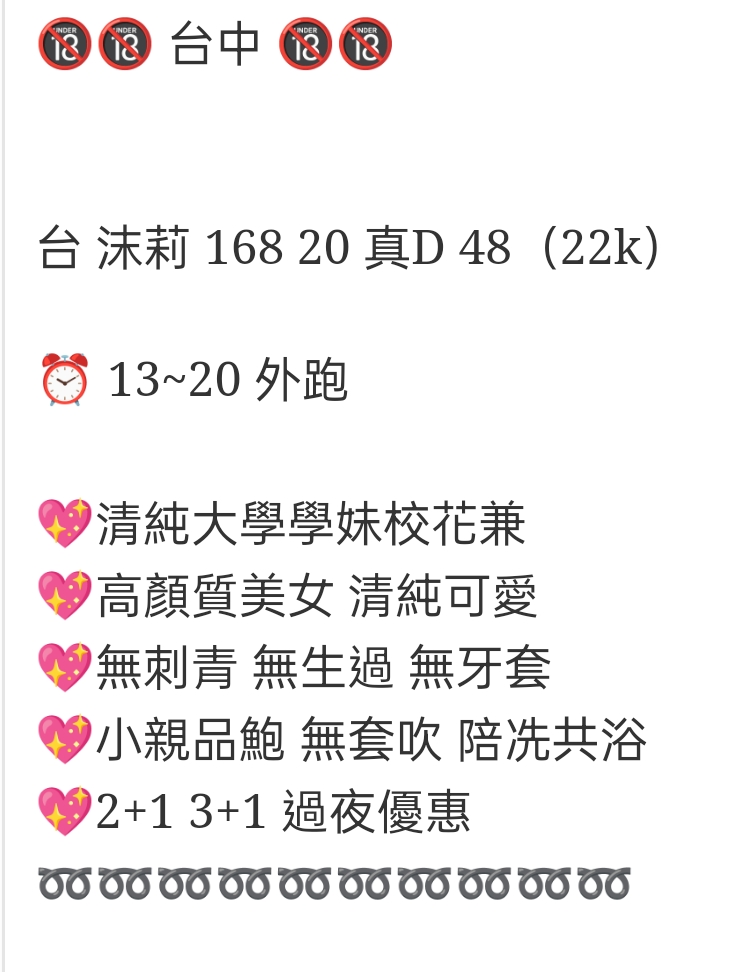 🇹🇼台中外約台妹 沫莉 台中 台 沫莉 168 20 真D 48(22k) ⏰ 13~20 外跑 清純大學學妹校花兼 高顏質美女 清純可愛 無刺青 無生過 無牙套 小親品鮑 無套吹 陪冼共浴 2+1 3+1 過夜優惠 ➿️➿️➿️➿️➿️➿️➿️➿️➿️➿️ 相關商品 Quick View Quick View 🇹🇼台中北區定點台妹/可外約 叮噹 Quick View Quick View 🇹🇼台中高檔外約台妹 IG網美Jennie Quick View Quick View 🇹🇼台中外約台妹 柔安