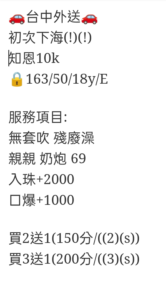 ??台中外約台妹 知恩 ?台中外送? 初次下海(!)(!) 知恩10k ?163/50/18y/E 服務項目: 無套吹 殘廢澡 親親 奶炮 69 入珠+2000 口爆+1000 買2送1(150分/((2)(s)) 買3送1(200分/((3)(s)) 相關商品 Quick View Quick View 🇹🇼台中外約台妹 柔安 Quick View Quick View 🇹🇼台中高檔外約台妹 天心 Quick View Quick View 🇹🇼台中外約台妹 娜比