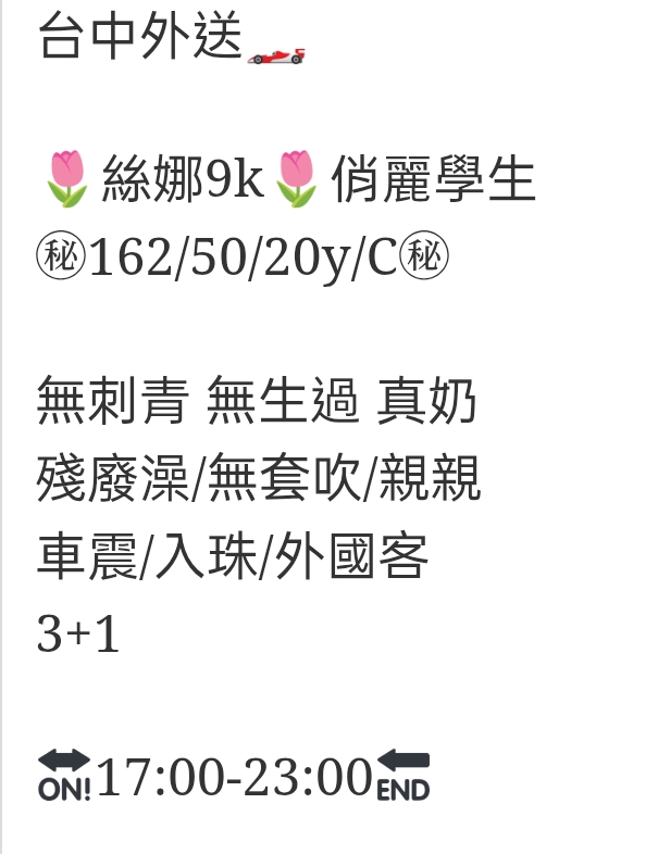 🇹🇼台中外約台妹 絲娜 台中外送🏎 🌷絲娜9k🌷俏麗學生 ㊙️162/50/20y/C㊙️ 無刺青 無生過 真奶 殘廢澡/無套吹/親親 車震/入珠/外國客 3+1 🔛17:00-23:00🔚 相關商品 Quick View Quick View 🇹🇼台中外約台妹 結衣 Quick View Quick View 🇹🇼台中外約台妹 小可 Quick View Quick View 🇹🇼台中外約台妹 娜比