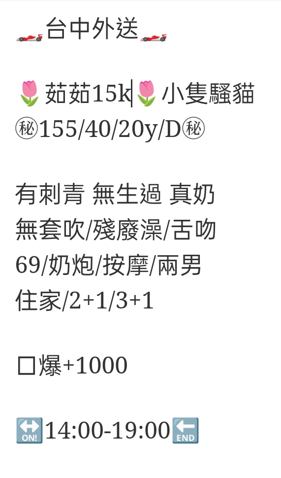 🇹🇼台中外約台妹 茹茹 台中外送 茹茹15k 小隻騷貓 ㊙️155/40/20y/D㊙️ 有刺青 無生過 真奶 無套吹/殘廢澡/舌吻 69/奶炮/按摩/兩男 住家/2+1/3+1 口爆+1000 14:00-19:00 相關商品 Quick View Quick View 🇹🇼台中外約台妹 芸妃 Quick View Quick View 🇹🇼台中外約台妹 洛妍 Quick View Quick View 🇹🇼台中北區定點台妹/可外約 叮噹