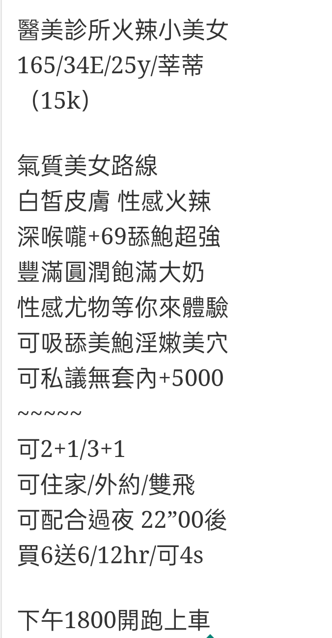 🇹🇼台中外約台妹 莘蒂 醫美診所火辣小美女 165/34E/25y/莘蒂 (15k) 氣質美女路線 白皙皮膚 性感火辣 深喉嚨+69舔鮑超強 豐滿圓潤飽滿大奶 性感尤物等你來體驗 可吸舔美鮑淫嫩美穴 可私議無套內+5000 ~~~~~ 可2+1/3+1 可住家/外約/雙飛 可配合過夜 22”00後 買6送6/12hr/可4s 下午1800開跑上車 相關商品 Quick View Quick View 🇹🇼台中外約台妹 柔安 Quick View Quick View 🇹🇼台中高檔外約台妹 天心 Quick View Quick View 🇹🇼台中外約台妹 草莓