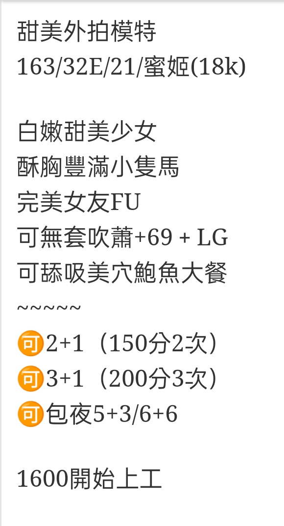 🇹🇼台中外約台妹 蜜姬 甜美外拍模特 163/32E/21/蜜姬(18k) 白嫩甜美少女 酥胸豐滿小隻馬 完美女友FU 可無套吹蕭+69+LG 可舔吸美穴鮑魚大餐 ~~~~~ ?2+1(150分2次) ?3+1(200分3次) ?包夜5+3/6+6 1600開始上工 相關商品 Quick View Quick View ??台中高檔外約台妹 韓伶 Quick View Quick View 🇹🇼台中北區定點台妹/可外約 叮噹 Quick View Quick View 🇹🇼台中外約台妹 黎黎