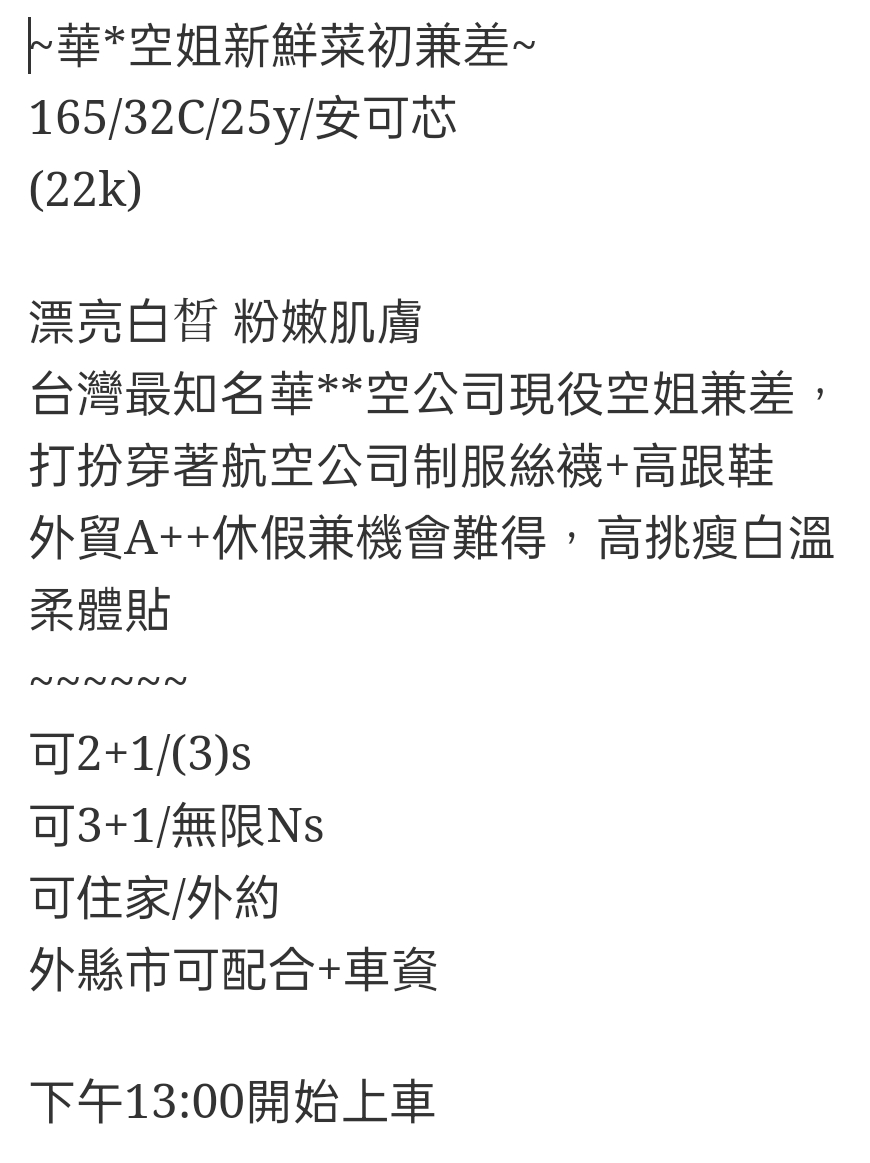 🇹🇼台中高檔外約台妹 安可芯 ~華*空姐新鮮菜初兼差~ 165/32C/25y/安可芯 (22k) 漂亮白晳 粉嫩肌膚 台灣最知名華**空公司現役空姐兼差,打扮穿著航空公司制服絲襪+高跟鞋 外貿A++休假兼機會難得,高挑瘦白溫柔體貼 ~~~~~~ 可2+1/(3)s 可3+1/無限Ns 可住家/外約 外縣市可配合+車資 下午13:00開始上車 相關商品 Quick View Quick View 🇹🇼台中外約台妹 陳思妤 Quick View Quick View 🇹🇼台中外約台妹 孫尚湘 Quick View Quick View 🇹🇼台中外約台妹 茉茉