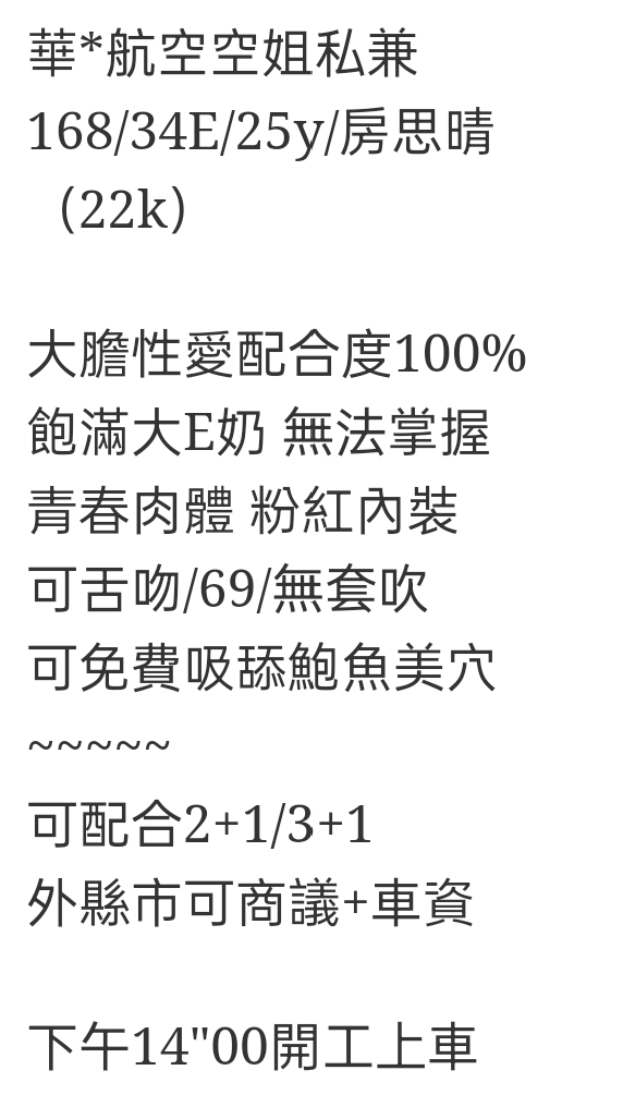 🇹🇼台中高檔外約台妹 房思晴 華*航空空姐私兼 168/34E/25y/房思晴 (22k) 大膽性愛配合度100% 飽滿大E奶 無法掌握 青春肉體 粉紅內裝 可舌吻/69/無套吹 可免費吸舔鮑魚美穴 ~~~~~ 可配合2+1/3+1 外縣市可商議+車資 下午14″00開工上車 相關商品 Quick View Quick View 🇹🇼台中外約台妹 薇晞 Quick View Quick View 🇹🇼台中北區定點台妹/可外約 球球 Quick View Quick View 🇹🇼台中北區定點台妹/可外約 叮噹