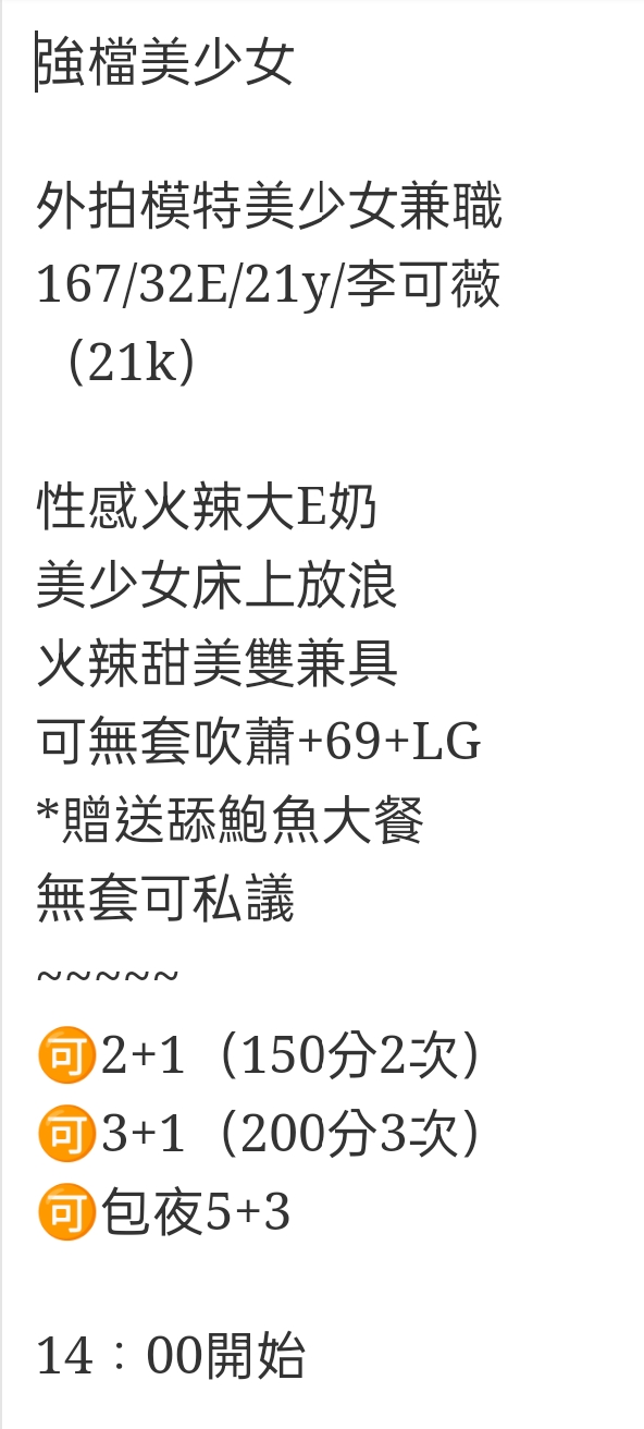 🇹🇼台中高檔外約台妹 李可薇 強檔美少女 外拍模特美少女兼職 167/32E/21y/李可薇 (21k) 性感火辣大E奶 美少女床上放浪 火辣甜美雙兼具 可無套吹蕭+69+LG *贈送舔鮑魚大餐 無套可私議 ~~~~~ ?2+1(150分2次) ?3+1(200分3次) ?包夜5+3 14:00開始 相關商品 Quick View Quick View 🇹🇼台中北區定點台妹/可外約 球球 Quick View Quick View 🇹🇼台中北區定點台妹/可外約 叮噹 Quick View Quick View 🇹🇼台中外約台妹 幼幼