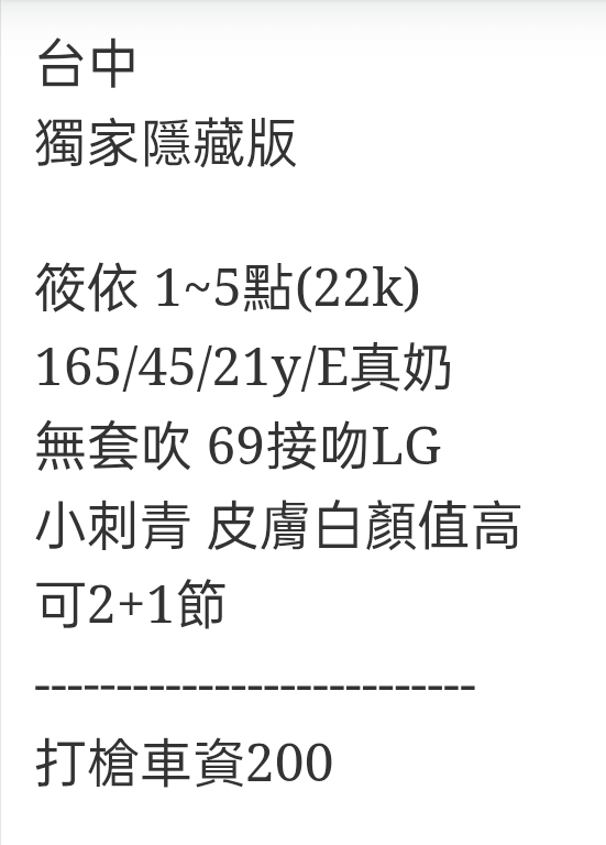 🇹🇼台中高檔外約台妹 筱依 台中 獨家隱藏版 筱依 1~5點(22k) 165/45/21y/E真奶 無套吹 69接吻LG 小刺青 皮膚白顏值高 可2+1節 —‐‐———————- 打槍車資200 相關商品 Quick View Quick View 🇹🇼台中外約台妹 茉茉 Quick View Quick View 🇹🇼台中外約台妹 芊芊 Quick View Quick View 🇹🇼台中外約台妹 芸妃
