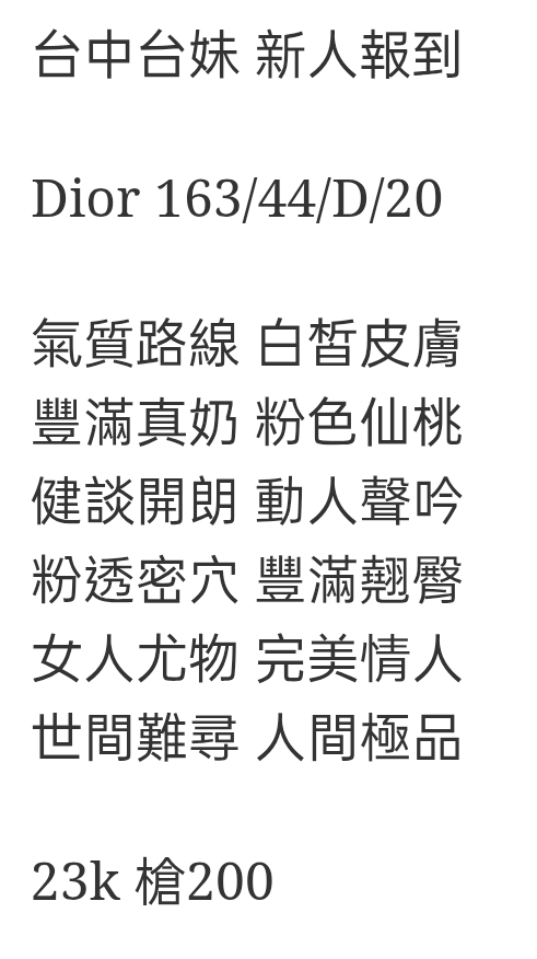 🇹🇼台中高檔外約台妹 Dior 台中台妹 新人報到 Dior 163/44/D/20 氣質路線 白皙皮膚 豐滿真奶 粉色仙桃 健談開朗 動人聲吟 粉透密穴 豐滿翹臀 女人尤物 完美情人 世間難尋 人間極品 23k 槍200 相關商品 Quick View Quick View 🇹🇼台中外約台妹 Tina Quick View Quick View 🇹🇼台中外約台妹 蕾蕾 Quick View Quick View 🇹🇼台中外約台妹 薇晞