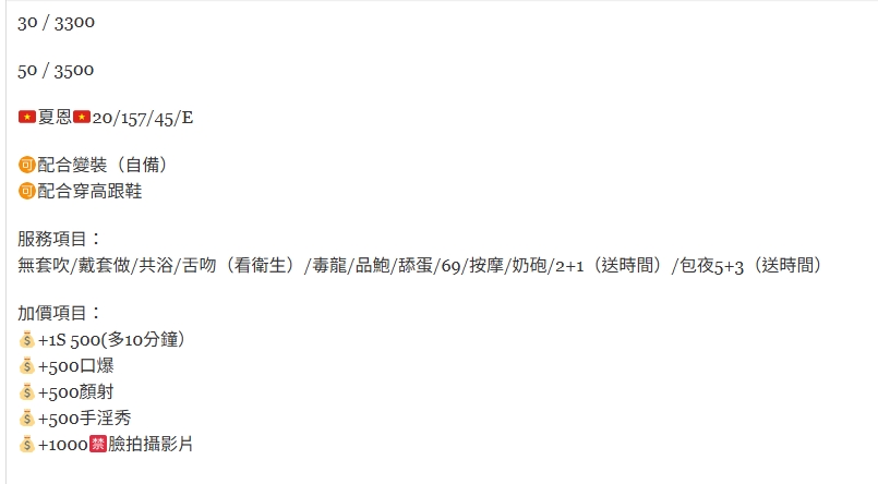 🇻🇳彰化定點越妹 夏恩 30 / 3300 50 / 3500 🇻🇳夏恩🇻🇳20/157/45/E 🉑配合變裝(自備) 🉑配合穿高跟鞋 服務項目: 無套吹/戴套做/共浴/舌吻(看衛生)/毒龍/品鮑/舔蛋/69/按摩/奶砲/2+1(送時間)/包夜5+3(送時間) 加價項目: 💰+1S 500(多10分鐘) 💰+500口爆 💰+500顏射 💰+500手淫秀 💰+1000🈲臉拍攝影片 相關商品 Quick View Quick View 🇲🇾彰化定點馬來妹 白希 Quick View Quick View 🇲🇾彰化定點馬來妹 爾晴 Quick View Quick View 🇲🇾彰化定點馬來妹 騷貓