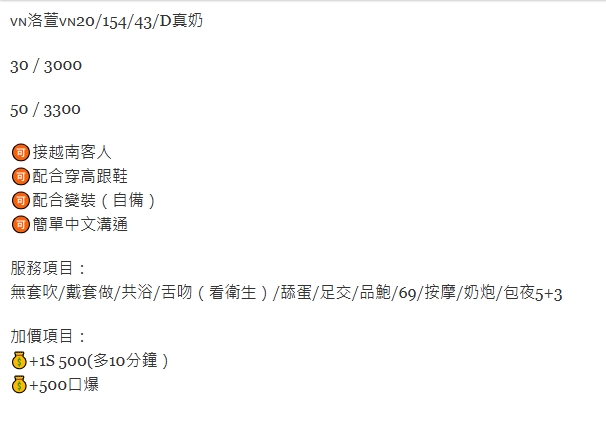 🇻🇳員林定點越妹 洛萱 洛萱 20/154/43/D真奶 30 / 3000 50 / 3300 接越南客人 配合穿高跟鞋 配合變裝(自備) 簡單中文溝通 服務項目: 無套吹/戴套做/共浴/舌吻(看衛生)/舔蛋/足交/品鮑/69/按摩/奶炮/包夜5+3 加價項目: +1S 500(多10分鐘) +500口爆 相關商品 Quick View Quick View 🇲🇾員林定點馬來妹 右右 Quick View Quick View 🇲🇾員林定點馬來妹 徐露 Quick View Quick View 🇲🇾員林定點馬來妹 念恩