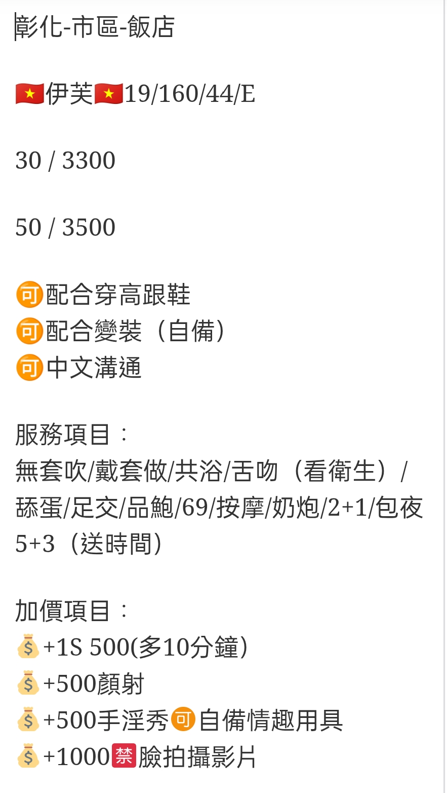 🇻🇳彰化定點越妹 伊芙 彰化-市區-飯店 🇻🇳伊芙🇻🇳19/160/44/E 30 / 3300 50 / 3500 🉑配合穿高跟鞋 🉑️配合變裝(自備) 🉑中文溝通 服務項目: 無套吹/戴套做/共浴/舌吻(看衛生)/舔蛋/足交/品鮑/69/按摩/奶炮/2+1/包夜5+3(送時間) 加價項目: 💰+1S 500(多10分鐘) 💰+500顏射 💰+500手淫秀🉑自備情趣用具 💰+1000🈲臉拍攝影片 相關商品 Quick View Quick View 🇲🇾彰化定點馬來妹 寧寧 Quick View Quick View 🇲🇾彰化定點馬來妹 令熙 Quick View Quick View 🇲🇾彰化定點馬來妹 糖寶