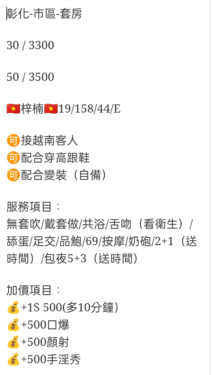 🇻🇳彰化定點越妹 梓楠 彰化-市區-套房 30 / 3300 50 / 3500 梓楠 19/158/44/E 接越南客人 配合穿高跟鞋 配合變裝(自備) 服務項目: 無套吹/戴套做/共浴/舌吻(看衛生)/舔蛋/足交/品鮑/69/按摩/奶砲/2+1(送時間)/包夜5+3(送時間) 加價項目: +1S 500(多10分鐘) +500口爆 +500顏射 +500手淫秀 相關商品 Quick View Quick View 🇲🇾彰化定點馬來妹 糖寶 Quick View Quick View 🇲🇾彰化定點馬來妹 穎樂 Quick View Quick View 🇲🇾彰化定點馬來妹 鹿希