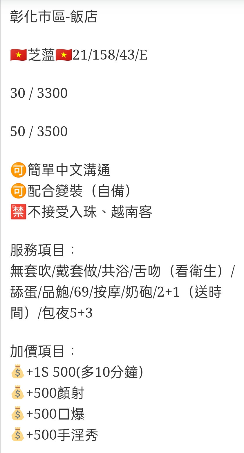🇻🇳彰化定點越妹 芝薀 彰化市區-飯店 🇻🇳芝薀🇻🇳21/158/43/E 30 / 3300 50 / 3500 🉑簡單中文溝通 🉑配合變裝(自備) 🈲️不接受入珠、越南客 服務項目: 無套吹/戴套做/共浴/舌吻(看衛生)/舔蛋/品鮑/69/按摩/奶砲/2+1(送時間)/包夜5+3 加價項目: 💰+1S 500(多10分鐘) 💰+500顏射 💰+500口爆 💰+500手淫秀 相關商品 Quick View Quick View 🇲🇾彰化定點馬來妹 蒂娜 Quick View Quick View 🇲🇾彰化定點馬來妹 韓孝敏 Quick View Quick View 🇲🇾彰化定點馬來妹 萊兒