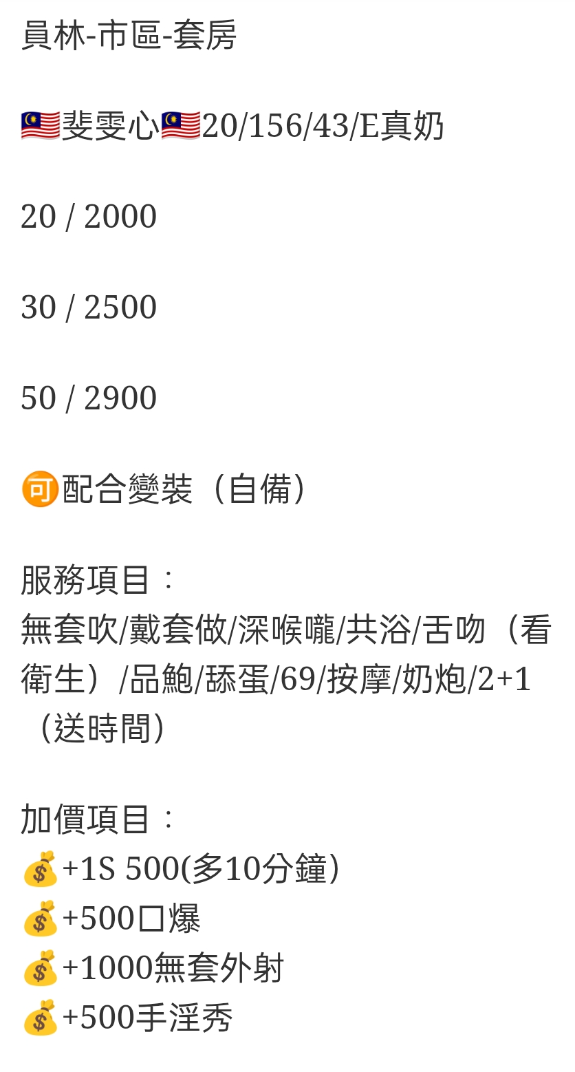 🇲🇾員林定點馬來妹 斐雯心 員林-市區-套房 🇲🇾斐雯心🇲🇾20/156/43/E真奶 20 / 2000 30 / 2500 50 / 2900 🉑️配合變裝(自備) 服務項目: 無套吹/戴套做/深喉嚨/共浴/舌吻(看衛生)/品鮑/舔蛋/69/按摩/奶炮/2+1(送時間) 加價項目: 💰+1S 500(多10分鐘) 💰+500口爆 💰+1000無套外射 💰+500手淫秀 相關商品 Quick View Quick View 🇲🇾員林定點馬來妹 奈比 Quick View Quick View 🇲🇾員林定點馬來妹 思緹 Quick View Quick View 🇻🇳員林定點越妹 妃凡