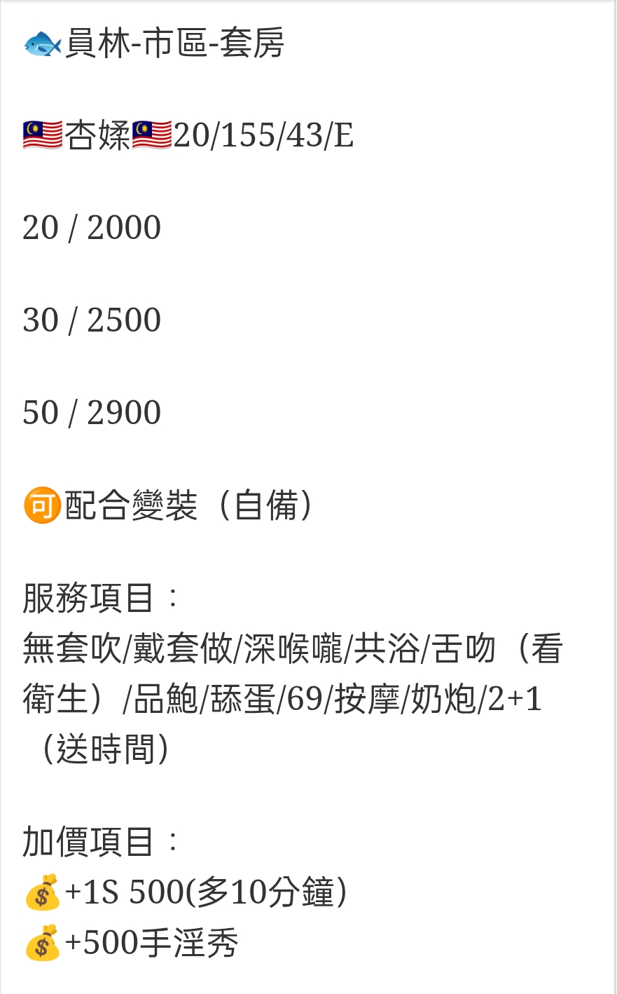 🇲🇾員林定點馬來妹 杏媃 🐟員林-市區-套房 🇲🇾杏媃🇲🇾20/155/43/E 20 / 2000 30 / 2500 50 / 2900 🉑️配合變裝(自備) 服務項目: 無套吹/戴套做/深喉嚨/共浴/舌吻(看衛生)/品鮑/舔蛋/69/按摩/奶炮/2+1(送時間) 加價項目: 💰+1S 500(多10分鐘) 💰+500手淫秀 相關商品 Quick View Quick View 🇲🇾員林定點馬來妹 李郁葶 Quick View Quick View 🇲🇾員林定點馬來妹 球球 Quick View Quick View 🇻🇳員林定點越妹 希媛