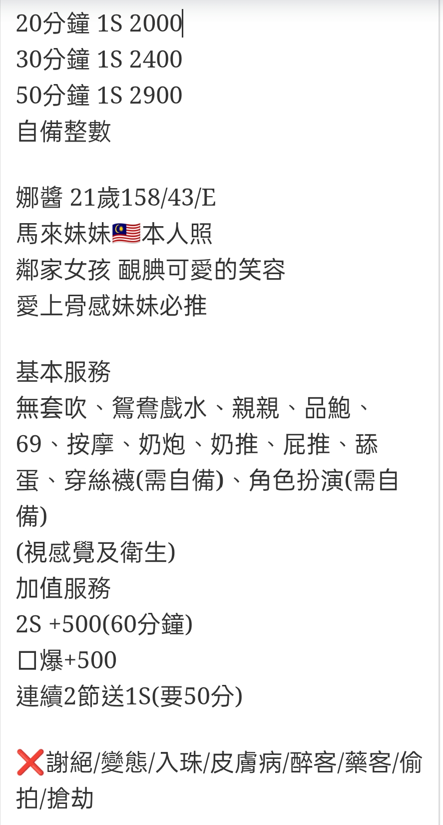 🇲🇾彰化定點馬來妹 娜醬 https://verytai.net/wp-content/uploads/2026/03/LINE_MOVIE_1772669366819.mp4 20分鐘 1S 2000 30分鐘 1S 2400 50分鐘 1S 2900 自備整數 娜醬 21歲158/43/E 馬來妹妹🇲🇾本人照 鄰家女孩 靦腆可愛的笑容 愛上骨感妹妹必推 基本服務 無套吹、鴛鴦戲水、親親、品鮑、69、按摩、奶炮、奶推、屁推、舔蛋、穿絲襪(需自備)、角色扮演(需自備) (視感覺及衛生) 加值服務 2S +500(60分鐘) 口爆+500 連續2節送1S(要50分) ❌謝絕/變態/入珠/皮膚病/醉客/藥客/偷拍/搶劫 相關商品 Quick View Quick View 🇲🇾彰化定點馬來妹 小桃子 Quick View Quick View 🇲🇾彰化定點馬來妹 莎淇 Quick View Quick View 🇲🇾彰化定點馬來妹 傾妮