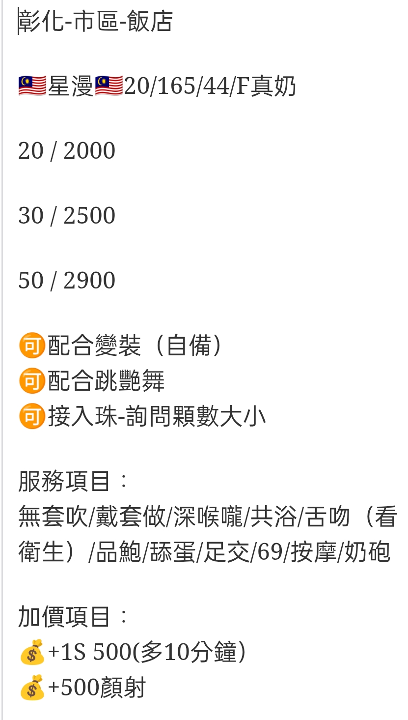 🇲🇾彰化定點馬來妹 星漫 彰化-市區-飯店 🇲🇾星漫🇲🇾20/165/44/F真奶 20 / 2000 30 / 2500 50 / 2900 🉑配合變裝(自備) 🉑配合跳艷舞 🉑接入珠-詢問顆數大小 服務項目: 無套吹/戴套做/深喉嚨/共浴/舌吻(看衛生)/品鮑/舔蛋/足交/69/按摩/奶砲 加價項目: 💰+1S 500(多10分鐘) 💰+500顏射 相關商品 Quick View Quick View 🇲🇾彰化定點馬來妹 希澈 Quick View Quick View 🇮🇩彰化定點印尼妹 舒允 Quick View Quick View 🇲🇾南投市定點馬來妹 甜蕎