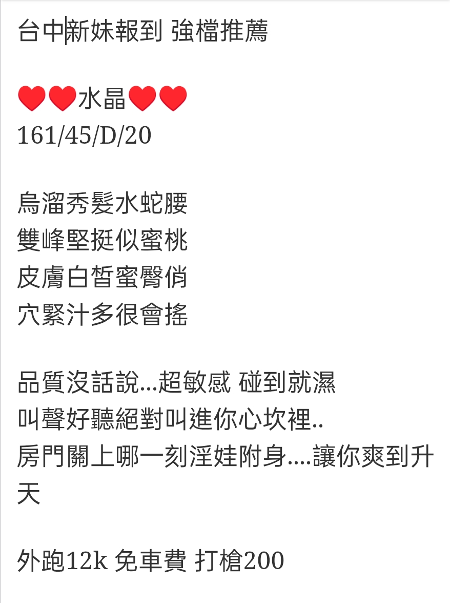 🇹🇼台中外約台妹 水晶 台中新妹報到 強檔推薦 ♥️♥️水晶♥️♥️ 161/45/D/20 烏溜秀髮水蛇腰 雙峰堅挺似蜜桃 皮膚白皙蜜臀俏 穴緊汁多很會搖 品質沒話說…超敏感 碰到就濕 叫聲好聽絕對叫進你心坎裡.. 房門關上哪一刻淫娃附身….讓你爽到升天 外跑12k 免車費 打槍200 相關商品 Quick View Quick View 🇹🇼台中高檔外約台妹 陳麗莎 Quick View Quick View 🇹🇼台中外約台妹 樂樂 Quick View Quick View 🇹🇼台中外約台妹 若薇