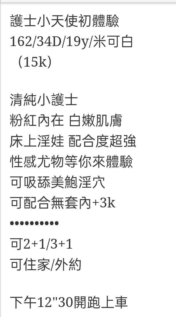 🇹🇼台中外約台妹 米可白 護士小天使初體驗 162/34D/19y/米可白 (15k) 清純小護士 粉紅內在 白嫩肌膚 床上淫娃 配合度超強 性感尤物等你來體驗 可吸舔美鮑淫穴 可配合無套內+3k •••••••••• 可2+1/3+1 可住家/外約 下午12″30開跑上車 相關商品 Quick View Quick View 🇹🇼台中外約台妹 孫尚湘 Quick View Quick View 🇹🇼台中高檔外約台妹 韓芸汐 Quick View Quick View 🇹🇼台中外約台妹 栗子