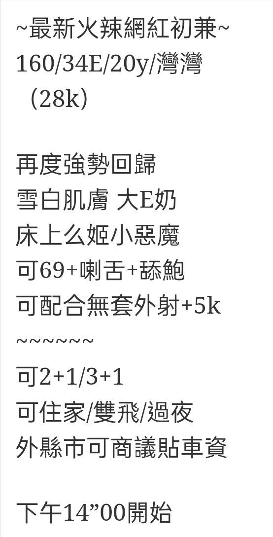 🇹🇼台中高檔外約台妹 灣灣 ~最新火辣網紅初兼~ 160/34E/20y/灣灣 (28k) 再度強勢回歸 雪白肌膚 大E奶 床上么姬小惡魔 可69+喇舌+舔鮑 可配合無套外射+5k ~~~~~~ 可2+1/3+1 可住家/雙飛/過夜 外縣市可商議貼車資 下午14”00開始 相關商品 Quick View Quick View 🇹🇼台中外約台妹 小潔 Quick View Quick View 🇹🇼台中外約台妹 凱欣 Quick View Quick View 🇹🇼台中外約台妹 柔安