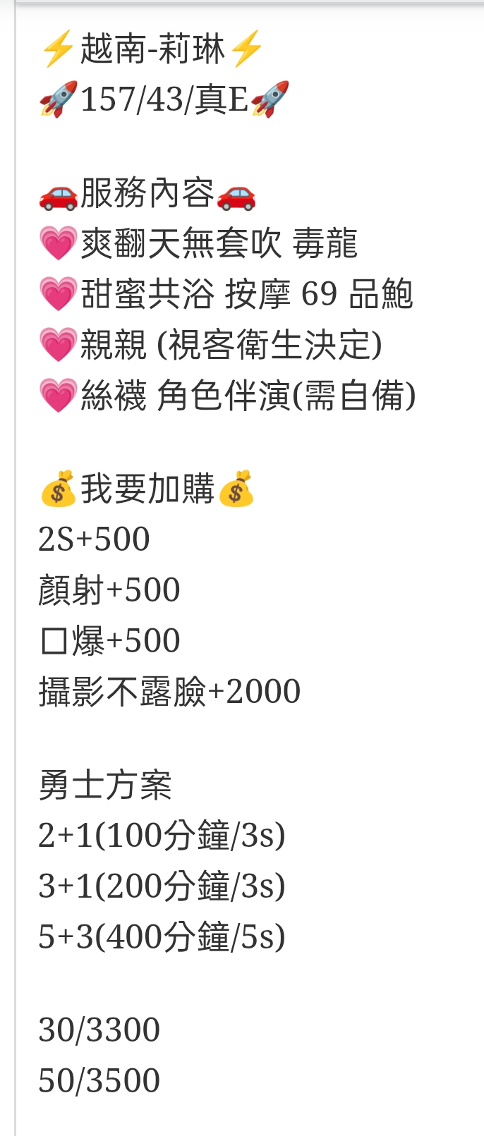 🇻🇳台中沙鹿越妹 莉琳 ⚡️越南-莉琳⚡️ 🚀157/43/真E🚀 🚗服務內容🚗 💗爽翻天無套吹 毒龍 💗甜蜜共浴 按摩 69 品鮑 💗親親 (視客衛生決定) 💗絲襪 角色伴演(需自備) 💰我要加購💰 2S+500 顏射+500 口爆+500 攝影不露臉+2000 勇士方案 2+1(100分鐘/3s) 3+1(200分鐘/3s) 5+3(400分鐘/5s) 30/3300 50/3500 相關商品 Quick View Quick View 🇲🇾台中沙鹿馬來妹 白白 Quick View Quick View 🇲🇾台中沙鹿馬來妹 淺淺 Quick View Quick View 🇲🇾台中豐原馬來妹 芊涵