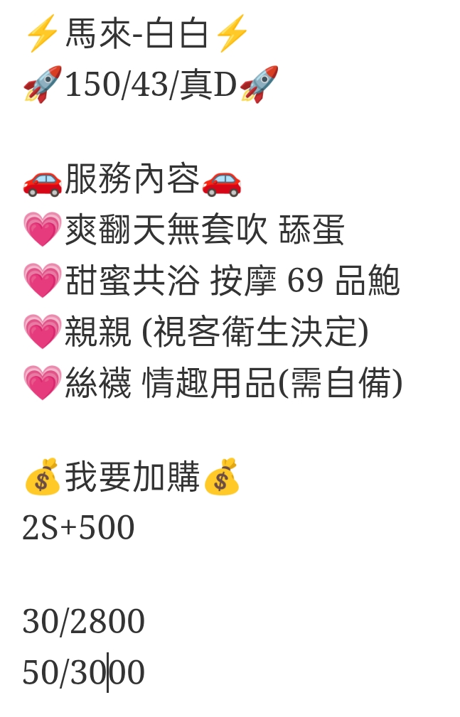 🇲🇾台中沙鹿馬來妹 白白 ⚡️馬來-白白⚡️ 🚀150/43/真D🚀 🚗服務內容🚗 💗爽翻天無套吹 舔蛋 💗甜蜜共浴 按摩 69 品鮑 💗親親 (視客衛生決定) 💗絲襪 情趣用品(需自備) 💰我要加購💰 2S+500 30/2800 50/3000 相關商品 Quick View Quick View 🇲🇾台中沙鹿馬來妹 乳乳 Quick View Quick View 🇲🇾台中沙鹿馬來妹 仙女 Quick View Quick View 🇲🇾台中沙鹿馬來妹 小呸