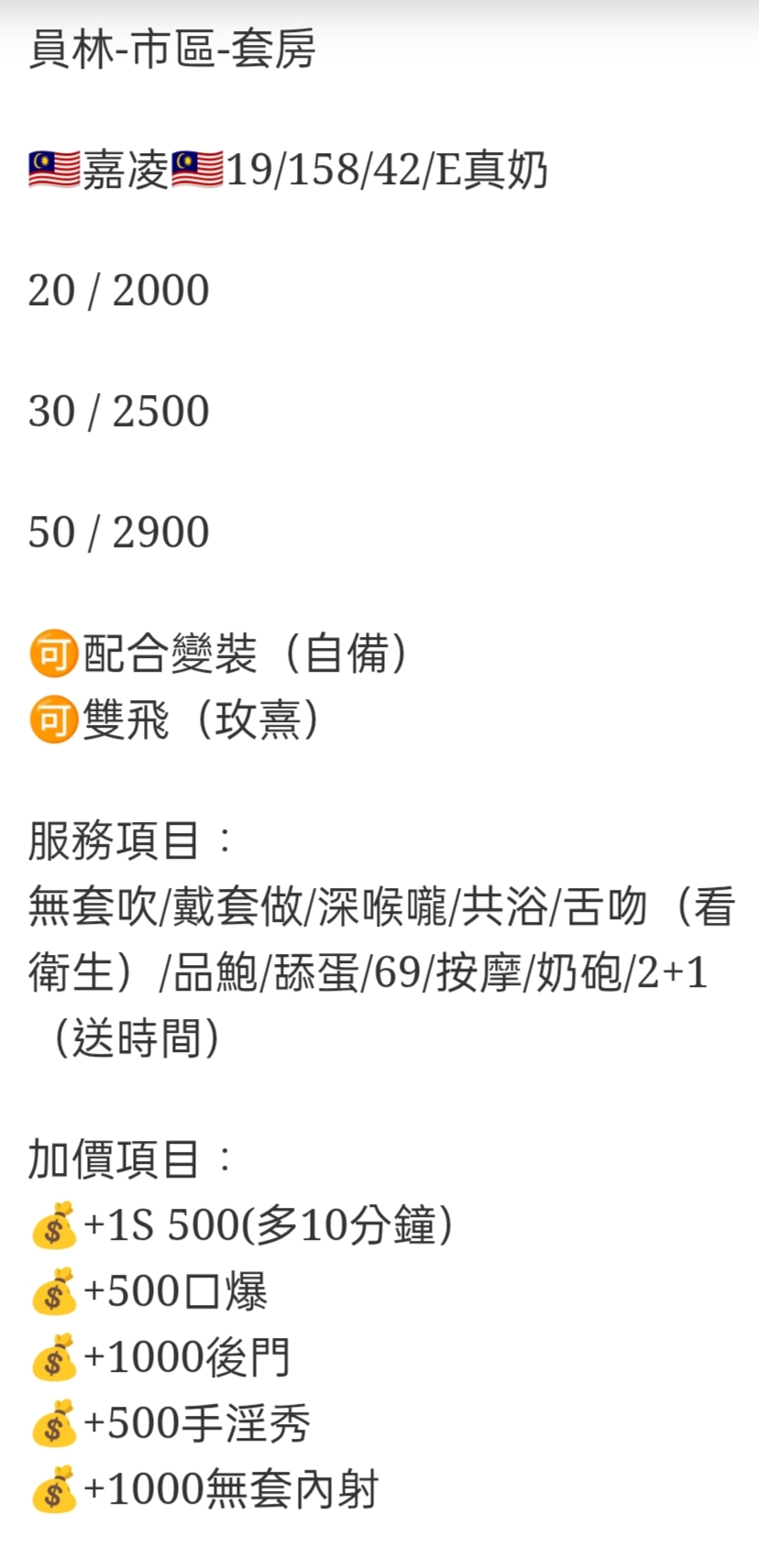🇲🇾員林定點馬來妹 嘉凌 員林-市區-套房 🇲🇾嘉凌🇲🇾19/158/42/E真奶 20 / 2000 30 / 2500 50 / 2900 🉑配合變裝(自備) 🉑雙飛(玫熹) 服務項目: 無套吹/戴套做/深喉嚨/共浴/舌吻(看衛生)/品鮑/舔蛋/69/按摩/奶砲/2+1(送時間) 加價項目: 💰+1S 500(多10分鐘) 💰+500口爆 💰+1000後門 💰+500手淫秀 💰+1000無套內射 相關商品 Quick View Quick View 🇲🇾員林定點馬來妹 緹希 Quick View Quick View 🇲🇾員林定點馬來妹 長玉 Quick View Quick View 🇲🇾員林定點馬來妹 語慕