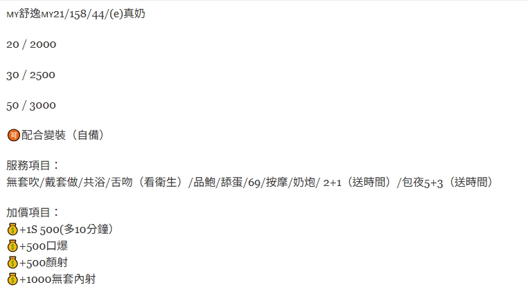 🇲🇾彰化定點馬來妹 舒逸 🇲🇾舒逸 21/158/44/(e)真奶 20 / 2000 30 / 2500 50 / 3000 配合變裝(自備) 服務項目: 無套吹/戴套做/共浴/舌吻(看衛生)/品鮑/舔蛋/69/按摩/奶炮/ 2+1(送時間)/包夜5+3(送時間) 加價項目: +1S 500(多10分鐘) +500口爆 +500顏射 +1000無套內射 相關商品 Quick View Quick View 🇲🇾彰化定點馬來妹 晴潔 Quick View Quick View 🇲🇾彰化定點馬來妹 希澈 Quick View Quick View 🇲🇾彰化定點馬來妹 朴恩洙