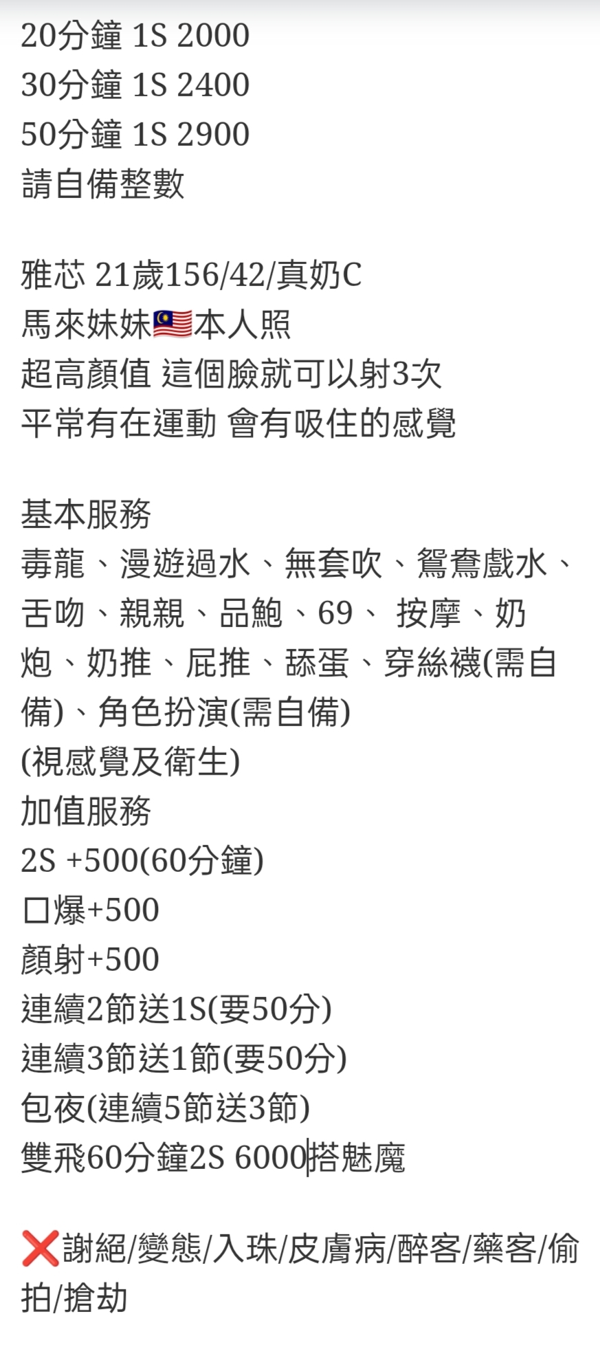 毒龍、漫遊過水、無套吹、鴛鴦戲水、舌吻、親親、品鮑、69、 按摩、奶炮、奶推、屁推、舔蛋、穿絲襪(需自備)、角色扮演(需自備)